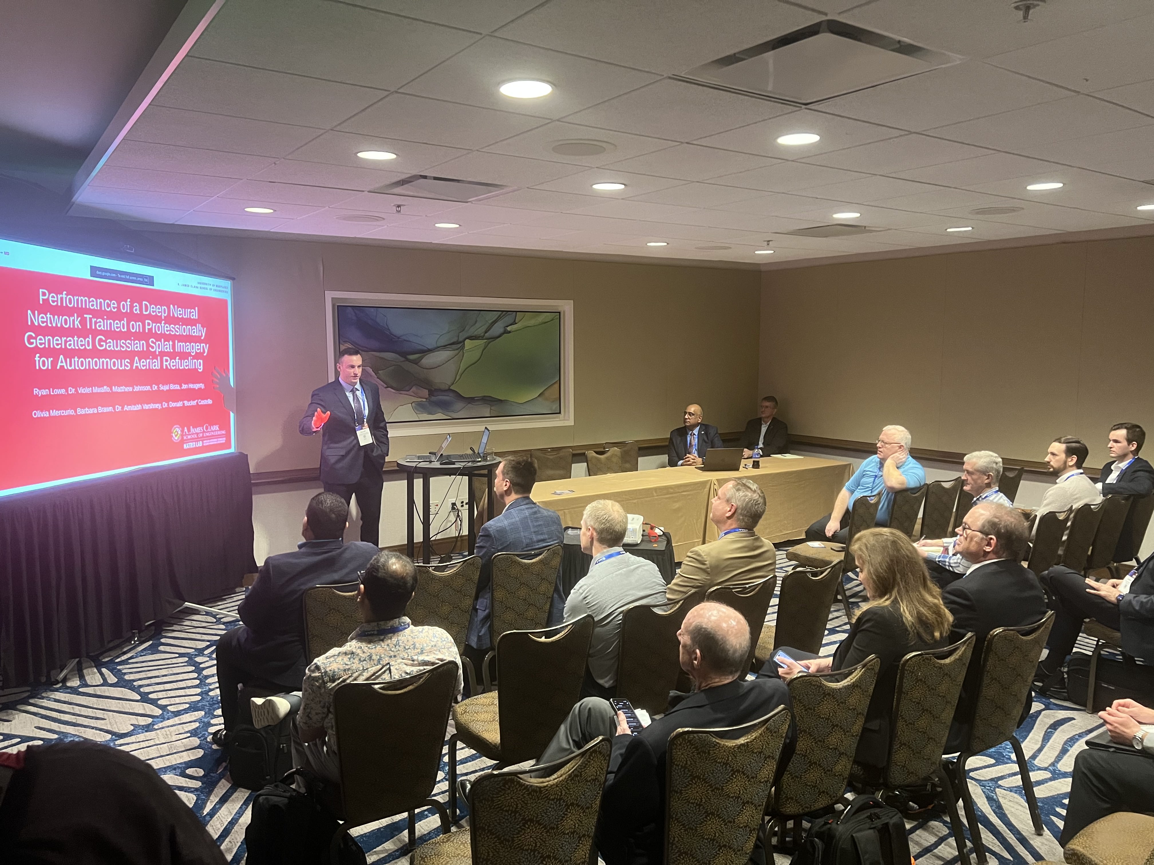 At SciTech, Ryan presented two papers. In Ryan's first presentation, he outlined how his team used realistic, computer-generated imagery to train a machine learning algorithm for detecting a drogue, which is a device towed behind a boat, or in this case, an aircraft, to slow it down. In coordination with the UMD Institute for Health Computing, he was able to demonstrate that a machine learning algorithm trained on synthetic data performed on par with one trained on actual flight test data. This demonstrated the tremendous cost savings of using synthetic data to train machine learning algorithms compared to the resource intensive practice of actual flight test. Ryan is also helping the system operate in the real world by enabling it with AI to detect the refueling basket and estimate how far away it is. His second presentation shared data showing that his computer vision-based machine learning algorithm could accurately determine the range to the aerial refueling drogue at both close and long range. Accurately determining these distances is critical for safe aerial refueling, and Ryan's research demonstrates that utilizing AI could make autonomous aerial refueling more reliable and practical for future naval operations.