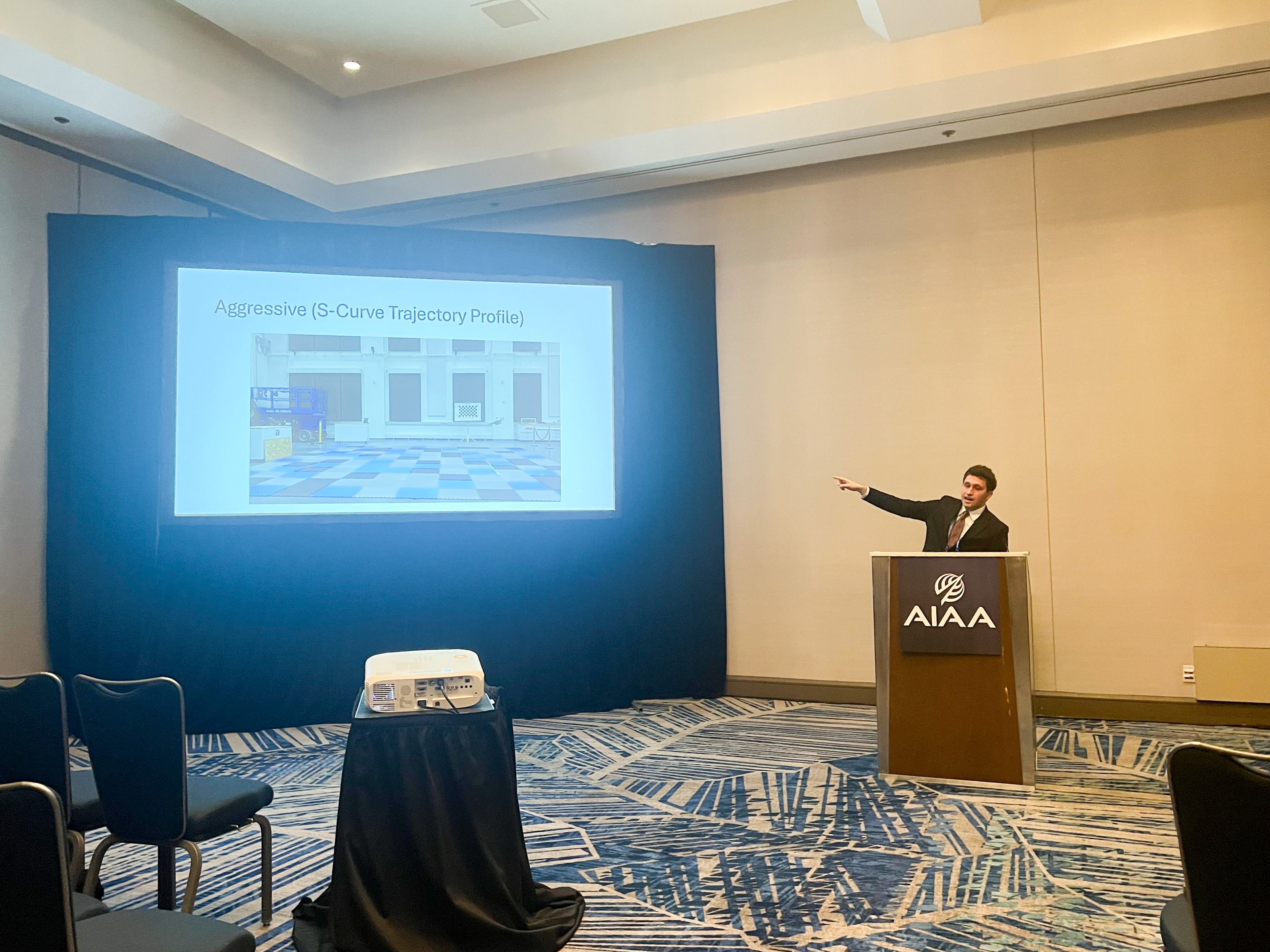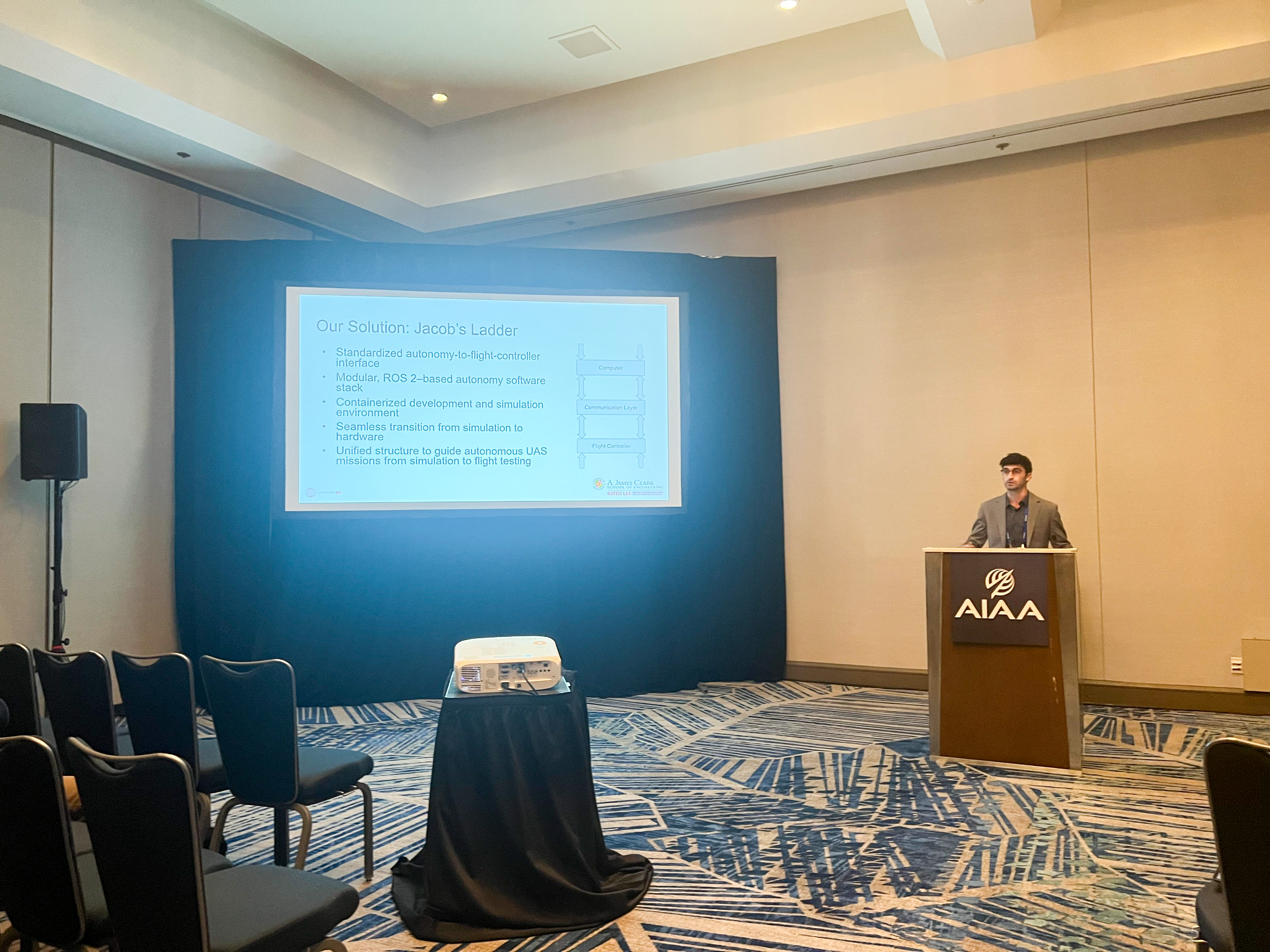 Jacob presented his work toward a consistent and flexible way for researchers to incorporate and evaluate alternative navigation and perception systems when GPS and radio signals cannot be used. His standardized system helps different parts of an autonomous drone work together more smoothly, enabling a seamless transition from simulation to hardware. This improves consistency, reduces development time and cost, and supports more scalable and repeatable testing. His research brings autonomous shipboard landings closer to practical use in challenging and contested environments.